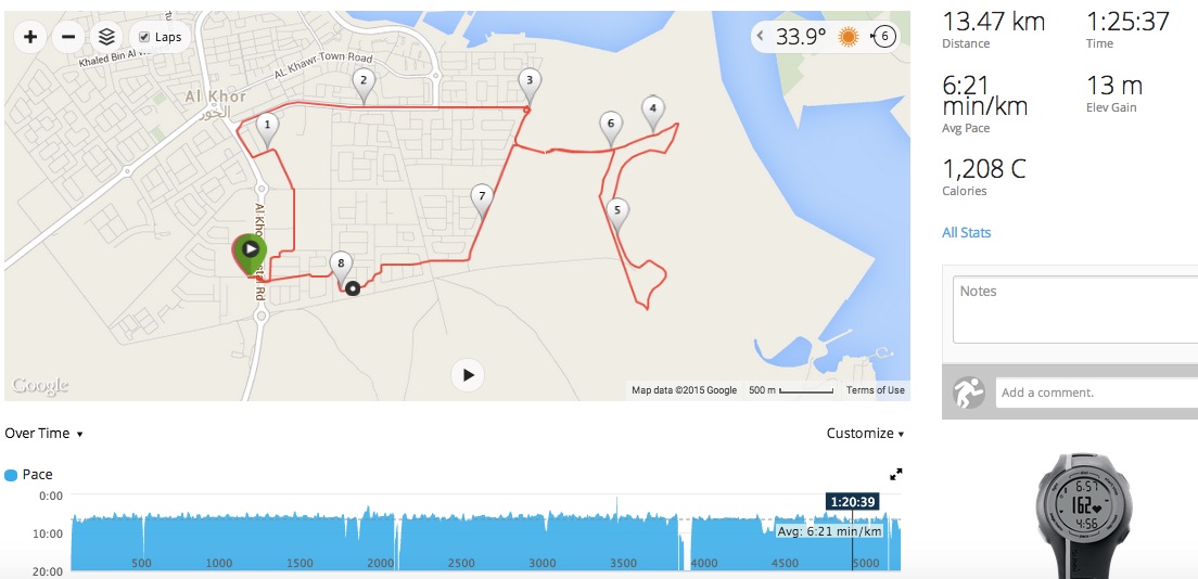 I say: Doha Bay Running Club are doing some running up at Al Kor – on the coast. There is no way I am missing out on that opportunity. I end up running for 90mins and cover 15K’s, pace is around the low 10min/mile mark and a few of those are even at optimal marathon pace. It is a little off plan (especially since I am in week 1) but flexibility is important.